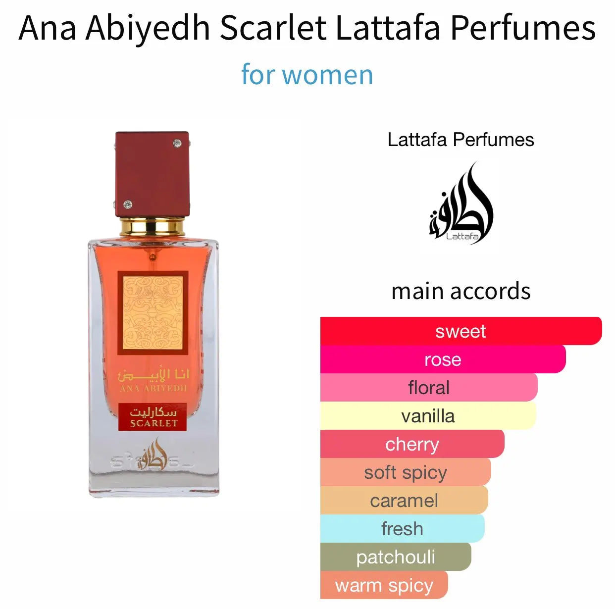 Ana Abiyedh Scarlet de Lattafa Perfumes (2025) es una fragancia femenina floral-frutal-gourmand que despierta los sentidos desde la primera nota. Una combinación exquisita de cereza negra, flores blancas y especias envolventes, sobre una base cálida y adictiva que deja huella.