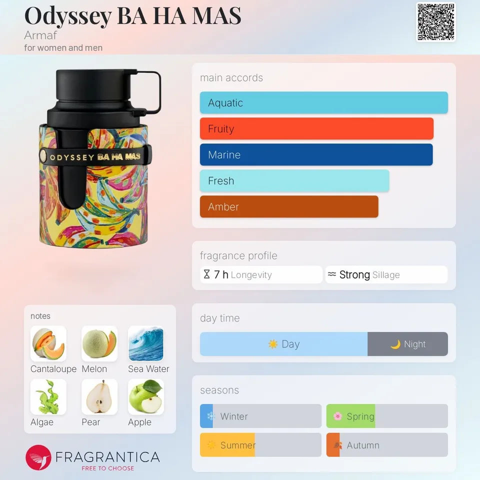 Odyssey BA HA MAS de Armaf es una fragancia árabe que te transporta instantáneamente a un paraíso isleño, donde el sol acaricia aguas turquesa y la brisa marina refresca la piel. Un aroma vibrante, limpio y sofisticado, ideal para quienes buscan frescura con personalidad.