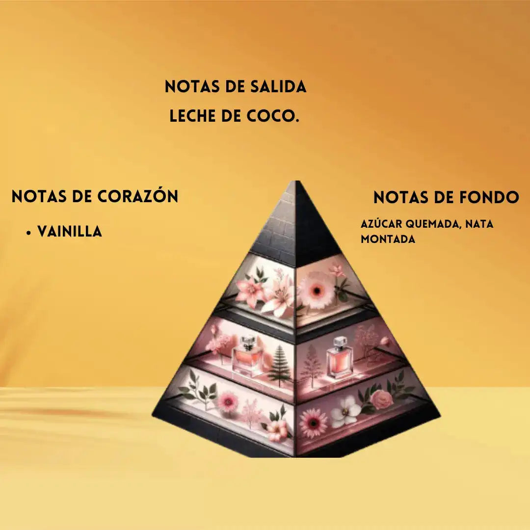 Desde el primer instante, cautiva con la fusión de coco fresco y leche cremosa, una combinación deliciosa que recuerda al placer de un postre irresistible. A medida que avanza, la vainilla sensual se vuelve protagonista, aportando calidez, sofisticación y una dulzura adictiva que transmite bienestar y ligereza, como si flotaras entre nubes.
