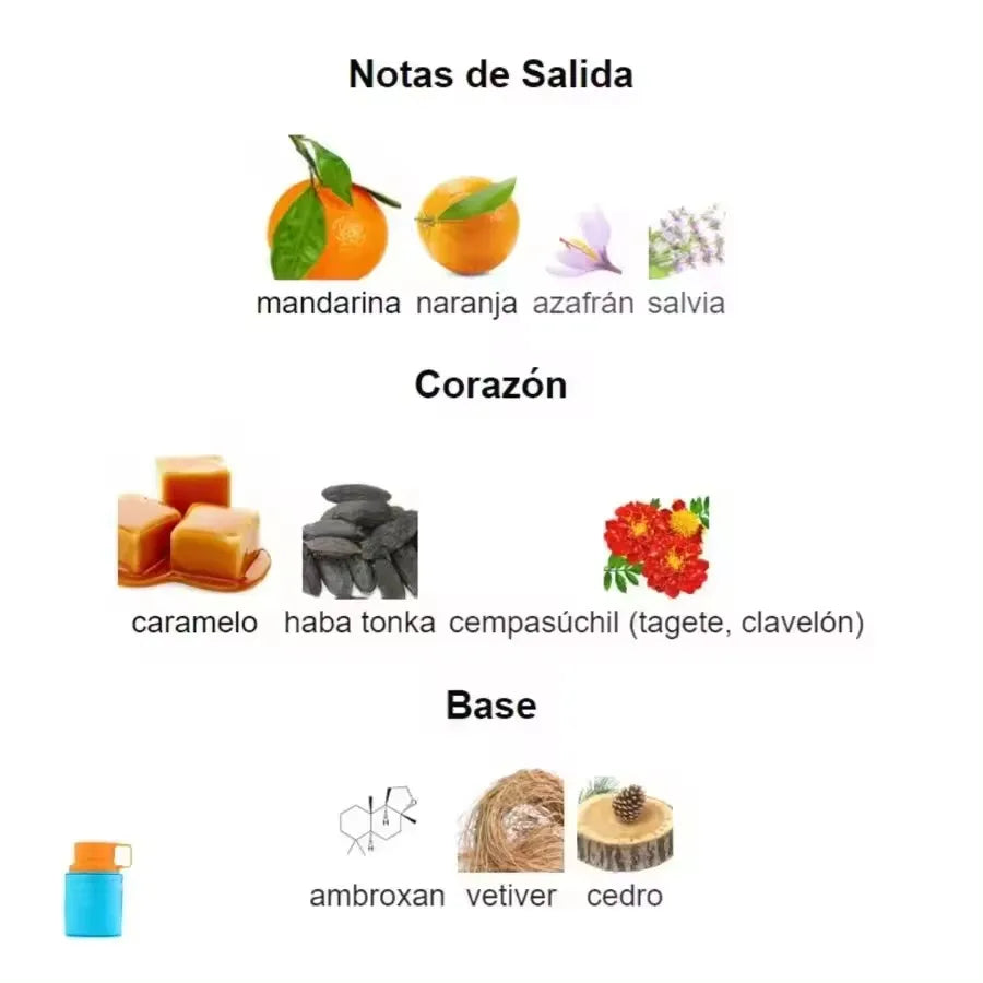 Notas de Salida: Mandarina, Naranja, Azafrán, Salvia