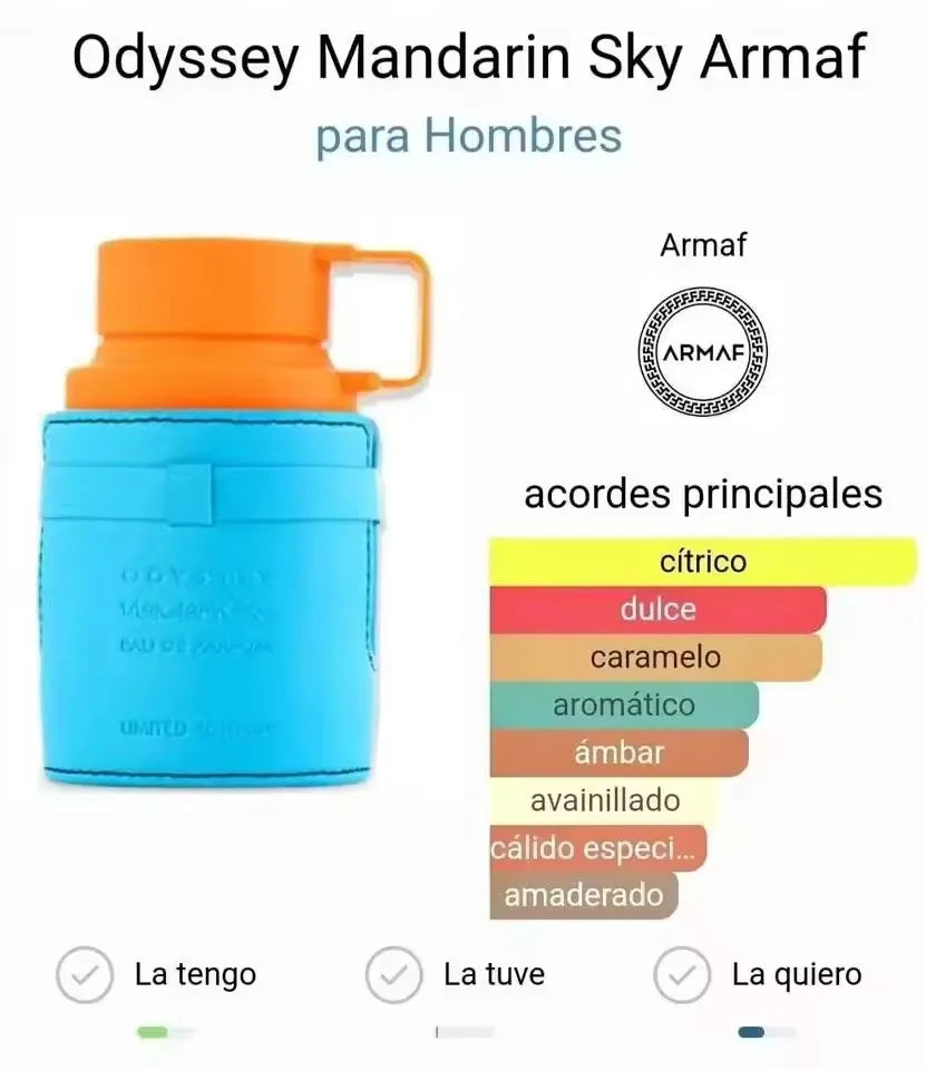 Odyssey Mandarin Sky de ARMAF es una fragancia de la familia olfativa para hombres, lanzada en 2023. Esta fragancia es ideal para aquellos que buscan una combinación única de frescura y calidez, perfecta para cualquier ocasión.